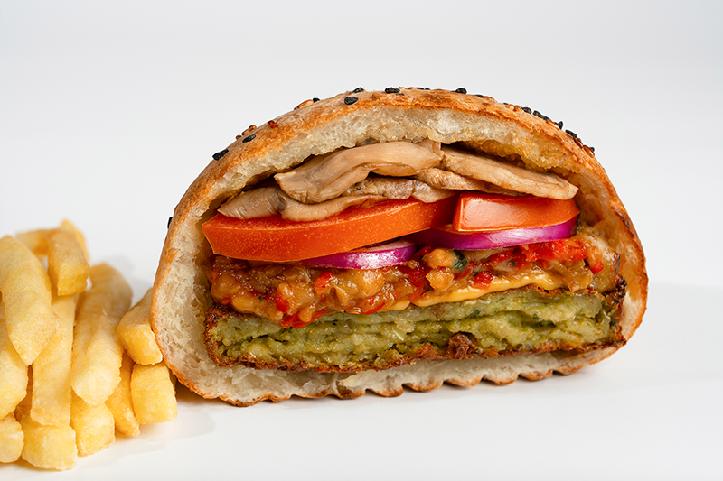 1 Adet Falafel Köftesi • Cheddar • Patlıcan Karışımı • Mor Soğan-Domates • Mantar Sos